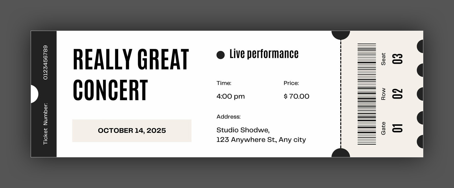 An event ticket is a convenient and professional way to design and distribute tickets for concerts, parties, conferences, or any special event. It includes key details such as event name, date, time, venue, and seat information, while also allowing space for branding and design elements. A well-designed ticket adds excitement and legitimacy to your event.