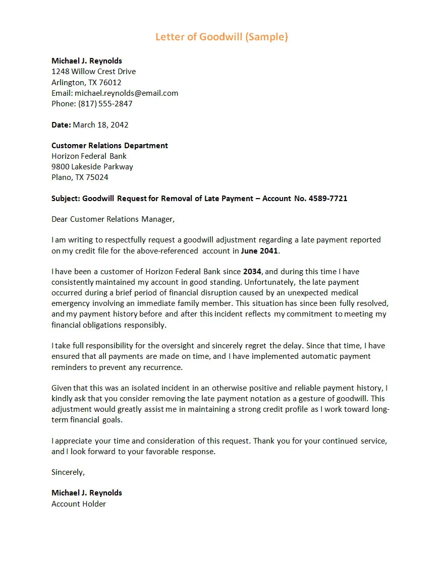 In the conclusion of your goodwill letter, clearly state your request for the removal of the late payment from your credit report. Be direct and specific in outlining your desired outcome, and express gratitude for the creditor’s consideration of your request. By clearly articulating your request and demonstrating appreciation for the creditor’s attention to your case, you can leave a positive impression and increase the likelihood of a favorable response to your goodwill letter.